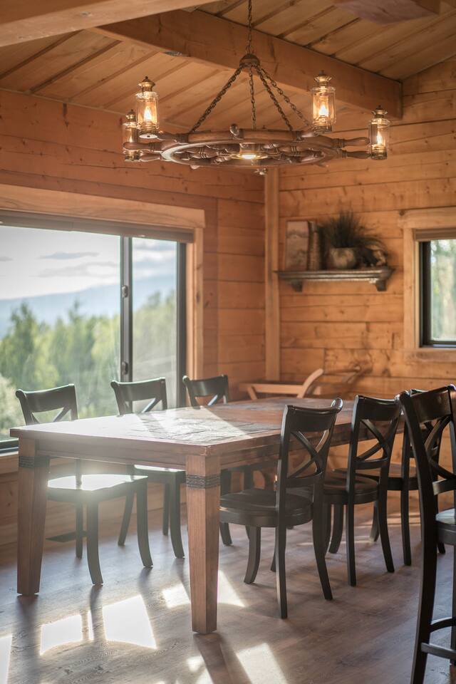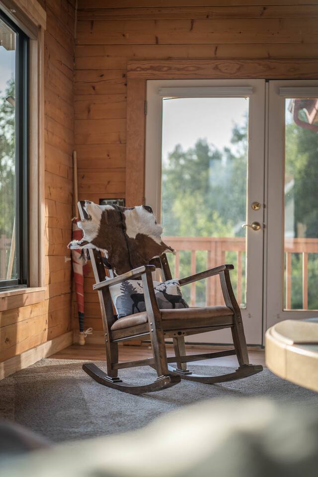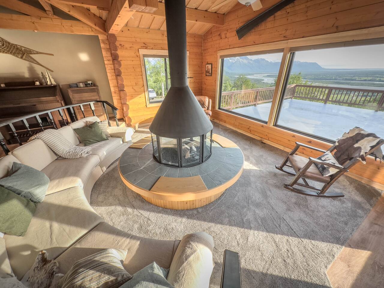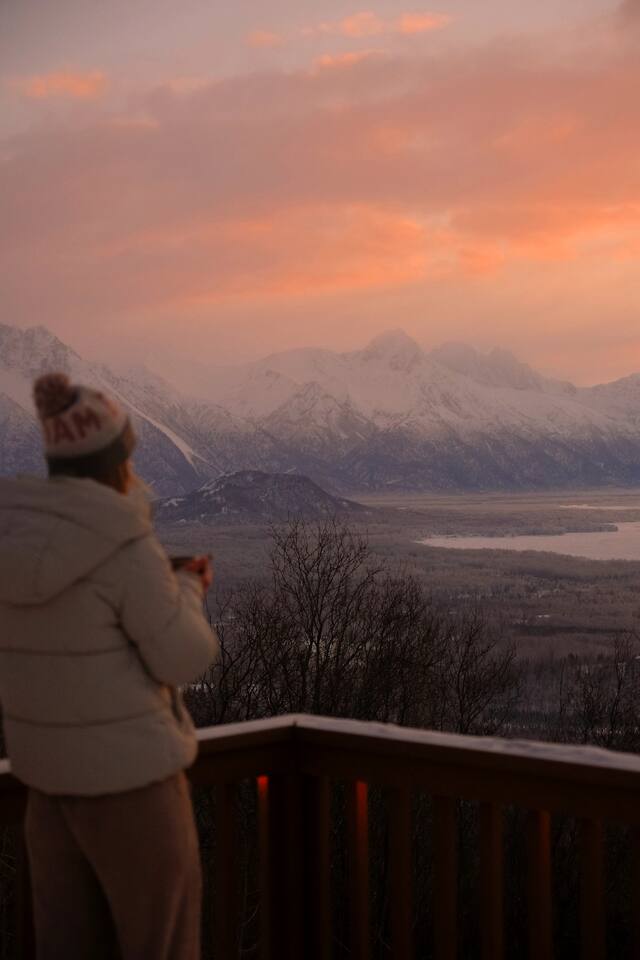 The unique Alaskan log construction with local black cottonwood accents creates an authentic and rustic ambiance. Gather around the circular gas fireplace for cozy evenings. Immerse yourself in the authentic charm of our log cabin, complete with a hot tub, cedar sauna, and a luxurious overhead rain steam shower. Palmer Alaska is a haven for outdoor enthusiasts. The nearby Lazy Mountain hiking trail (just a 5-minute walk from the cabin) beckons with stunning vistas, while fishing, hunting, kayaking, and more await just moments away. Convenience is at your fingertips, with the town center, restaurants, and stores just a short distance from the cabin. Our huge kitchen and dining space make meal preparation a breeze, and the massive deck allows for delightful outdoor entertaining with views of the Matanuska River valley. This Alaskan cabin is a celebration of true Alaska, complete with custom furniture and thoughtful touches. Please note there is a neighboring airbnb property to this home.