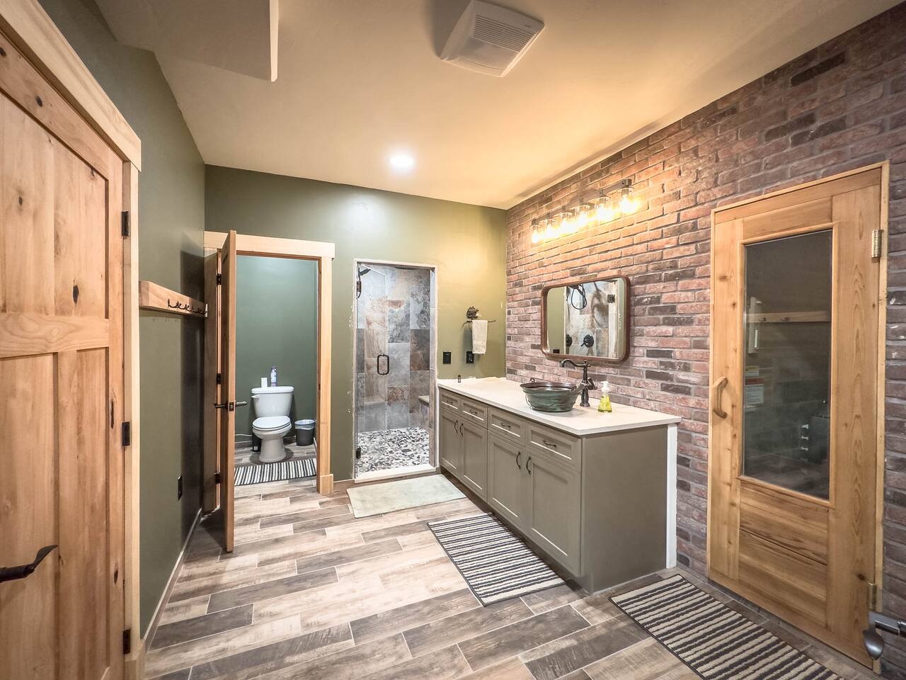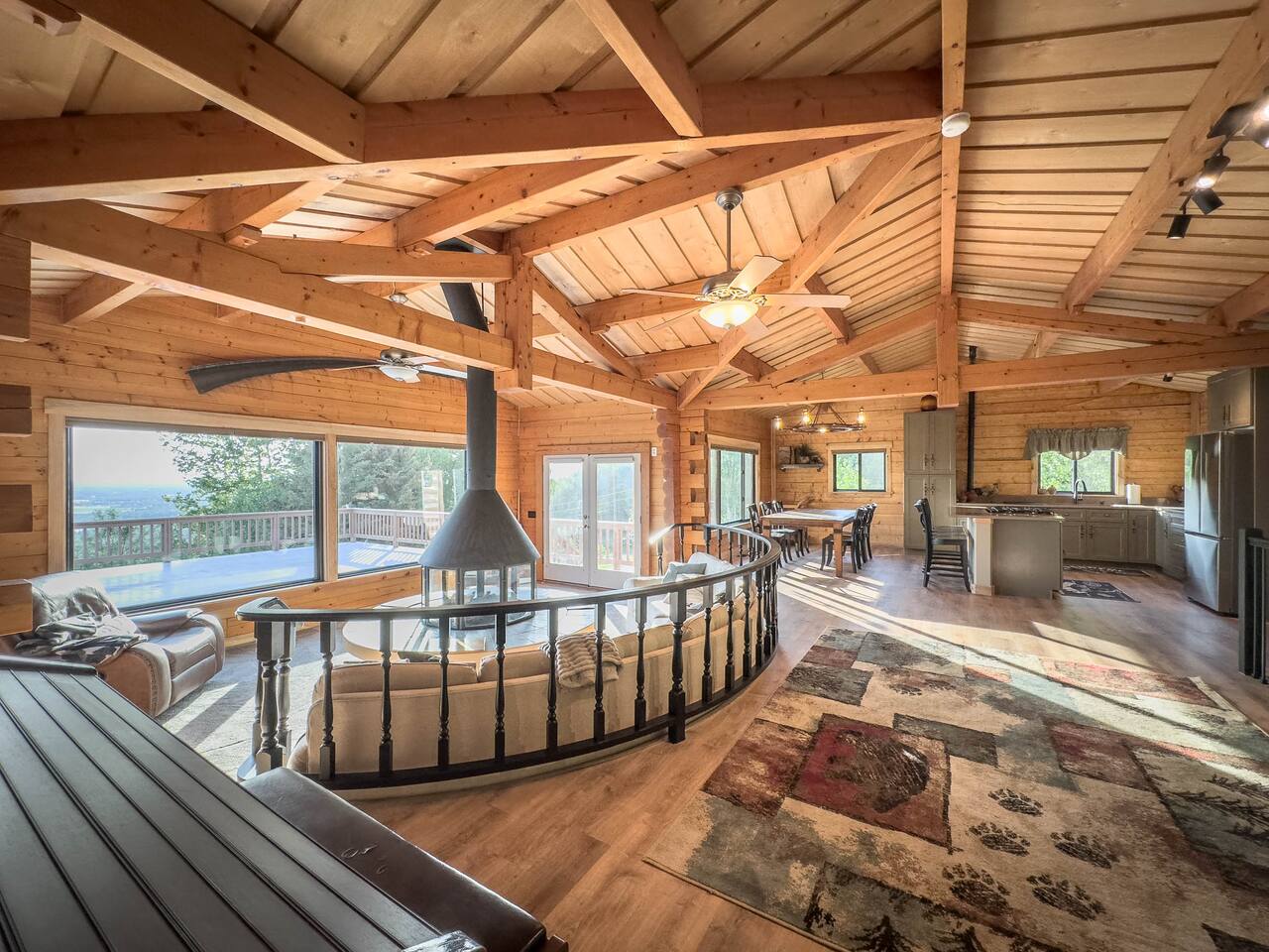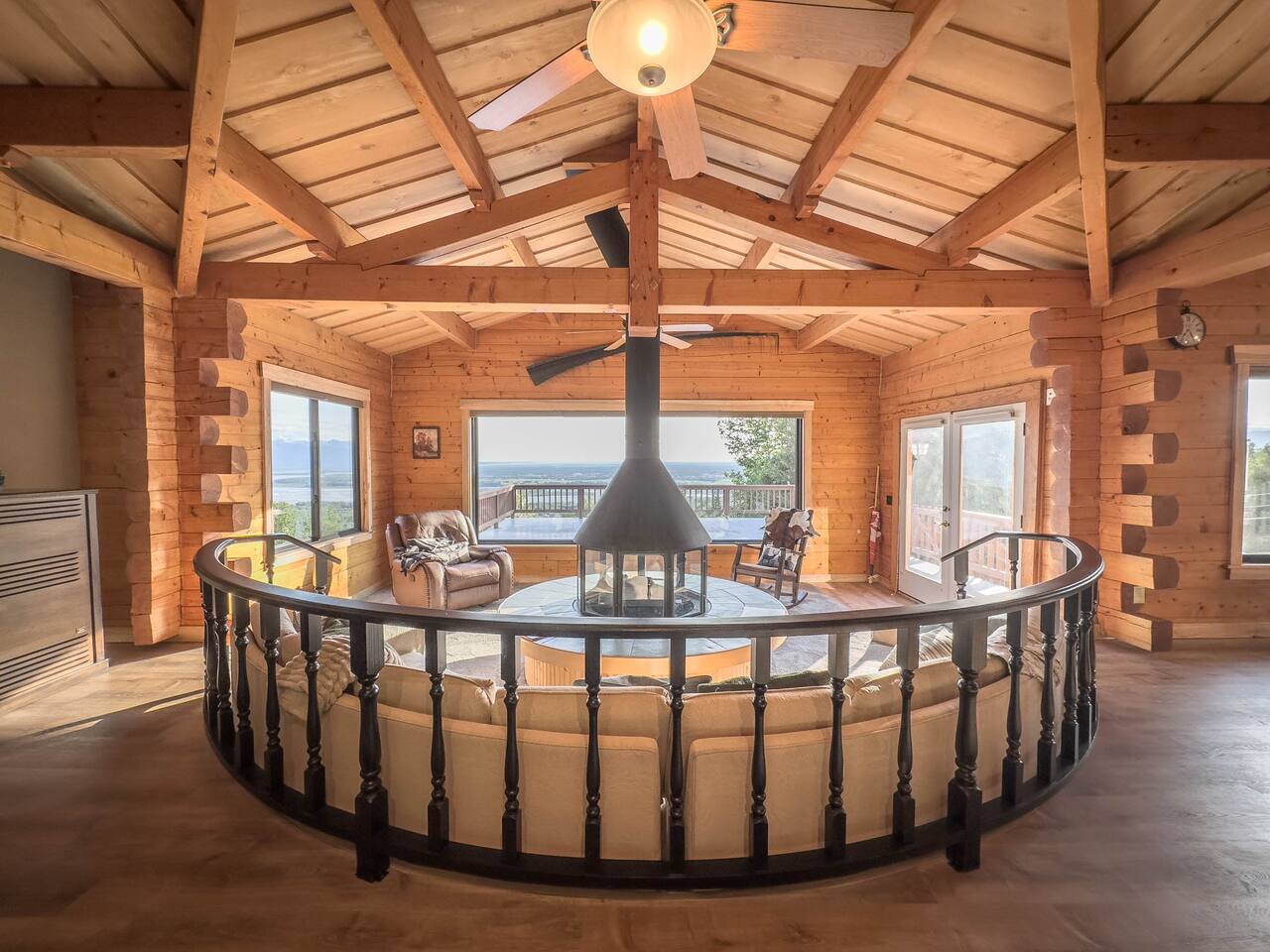 The unique Alaskan log construction with local black cottonwood accents creates an authentic and rustic ambiance. Gather around the circular gas fireplace for cozy evenings. Immerse yourself in the authentic charm of our log cabin, complete with a hot tub, cedar sauna, and a luxurious overhead rain steam shower. Palmer Alaska is a haven for outdoor enthusiasts. The nearby Lazy Mountain hiking trail (just a 5-minute walk from the cabin) beckons with stunning vistas, while fishing, hunting, kayaking, and more await just moments away. Convenience is at your fingertips, with the town center, restaurants, and stores just a short distance from the cabin. Our huge kitchen and dining space make meal preparation a breeze, and the massive deck allows for delightful outdoor entertaining with views of the Matanuska River valley. This Alaskan cabin is a celebration of true Alaska, complete with custom furniture and thoughtful touches. Please note there is a neighboring airbnb property to this home.