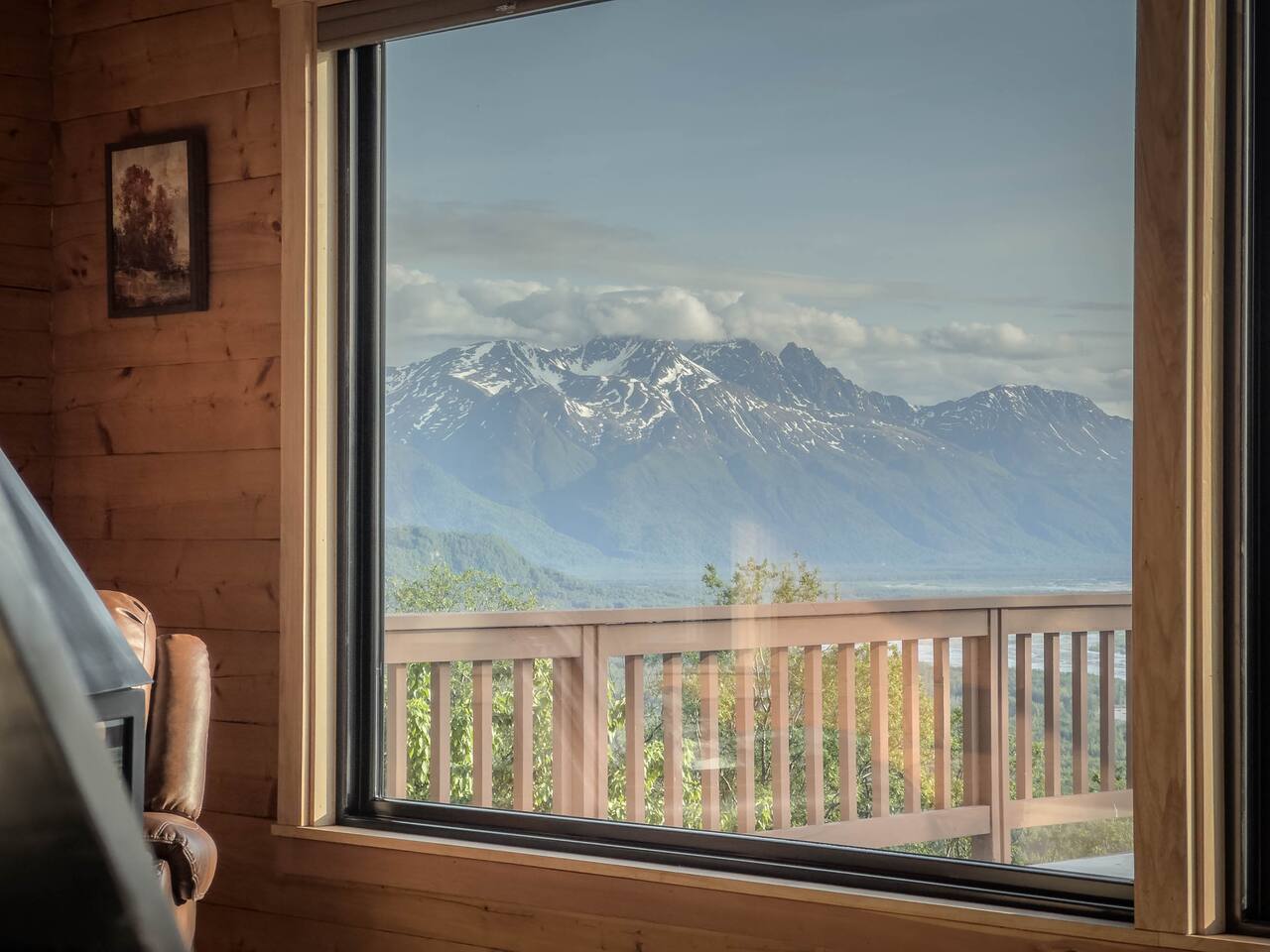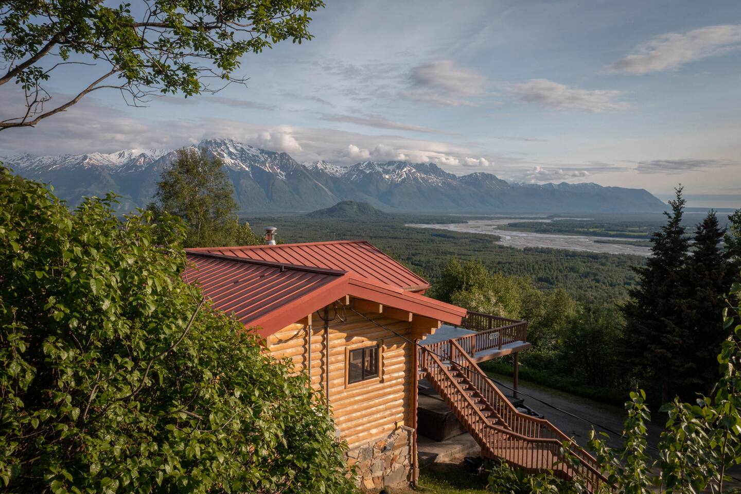 Escape to our breathtaking log cabin mountain retreat in Palmer and experience one of the best views in all of Alaska. This fully furnished cabin offers three bedrooms and 3.5 bathrooms, ensuring ample space for your family. Immerse yourself in the serene beauty of the valley mountain range from the expansive deck, complete with a hot tub featuring soothing jets. Relax and rejuvenate in the custom-built cedar sauna or indulge in the luxury of a steam shower after a day of outdoor adventures.